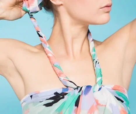 Estilo mas elegante, puedes atar el pareo alrededor de tu cuello. Primero retuerce ambos extremos de la tela como si fuera un cordón y después átalos en un arco alrededor del cuello.