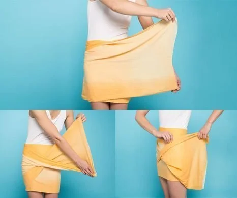 Coloca el pareo en tus caderas y envuélvelo dos veces alrededor de la cintura. Coge los dos extremos y gira la tela para darle un efecto ondulado a la parte delantera de la falda. Termínala metiendo los picos de tela sobrantes entre la piel y el tejido.