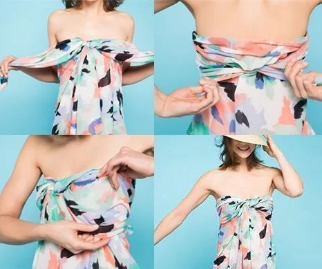 Coge los dos extremos del pareo entrelázalos por delante y átalos en la espalda. Una vez hecho ajusta el pareo en el pecho, para que parezca un glamuroso vestido de verano.